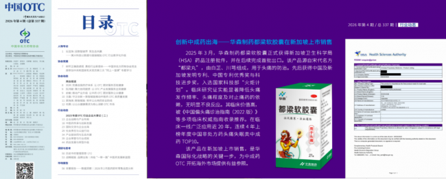 2025年3月,都梁软胶囊正式获得新加坡卫生科学局(HSA)药品注册批件,已在新加坡的新中、裕华国货、OG Guardian及众多主流中药行与商超上架销售,让现代中药切实服务于海外民众的健康需求。而近日,都梁软胶囊入选中国非处方药物协会2025年度OTC行业企业大事记征文,以《创新中成药出海——华森制药都梁软胶囊在新加坡上市销售》为题展出。这是行业对其临床价值与国际化探索的双重肯定。