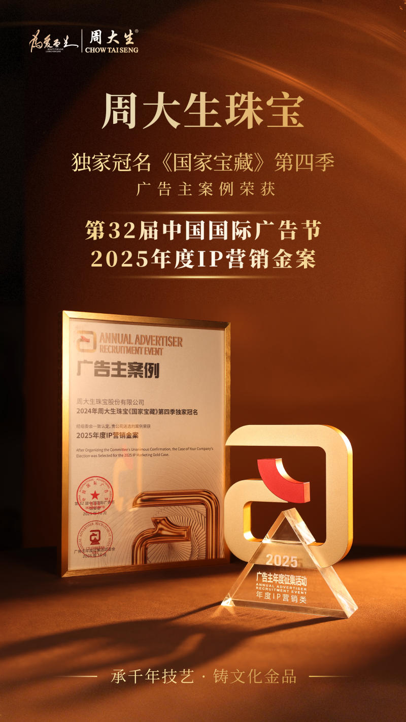 战略既定,落地为先。为将品牌定位转化为高端市场的深度认知,周大生×国家宝藏以线上权威媒体为支点,构筑文化高度。2025年,品牌以央视为核心阵地,借力国家级文化平台的公信力,将品牌叙事纳入主流文化语境,以权威背书赋能高端价值表达。同年,周大生×国家宝藏更荣获第32届中国国际广告节的“2025年度IP营销金案”奖项,标志着行业对品牌创新营销成果的高度认可,持续强化其在高端市场的文化认同。
